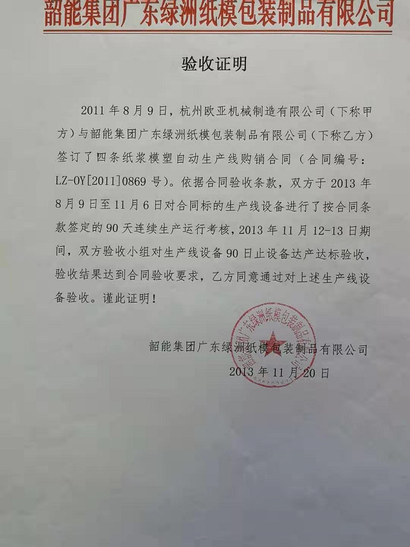 韶能集團(tuán)廣東綠洲紙模包裝制品有限公司,從2010年開始,前后分4期共購(gòu)買歐亞機(jī)械A(chǔ)E920型全自動(dòng)紙漿模塑餐具設(shè)備生產(chǎn)線72臺(tái),全部達(dá)產(chǎn)達(dá)標(biāo),并通過(guò)驗(yàn)收。廣東綠洲公司是歷史悠久的著名紙漿模塑制品生產(chǎn)企業(yè),生產(chǎn)高品質(zhì)的紙漿模塑制品,是國(guó)內(nèi)紙漿模塑制品生產(chǎn)企業(yè)的標(biāo)桿。