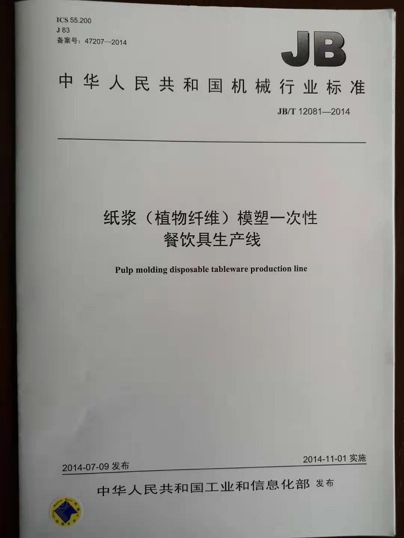 中華人民共和國行業(yè)標準:?紙漿(植物纖維)模塑一次性餐飲具生產(chǎn)線?2014-11-1實施。標準代號JB/T 12081-2014。本標準由鄭天波起草。是關于環(huán)保餐具設備生產(chǎn)線的紙漿模塑設備方面的第一個行業(yè)標準。
