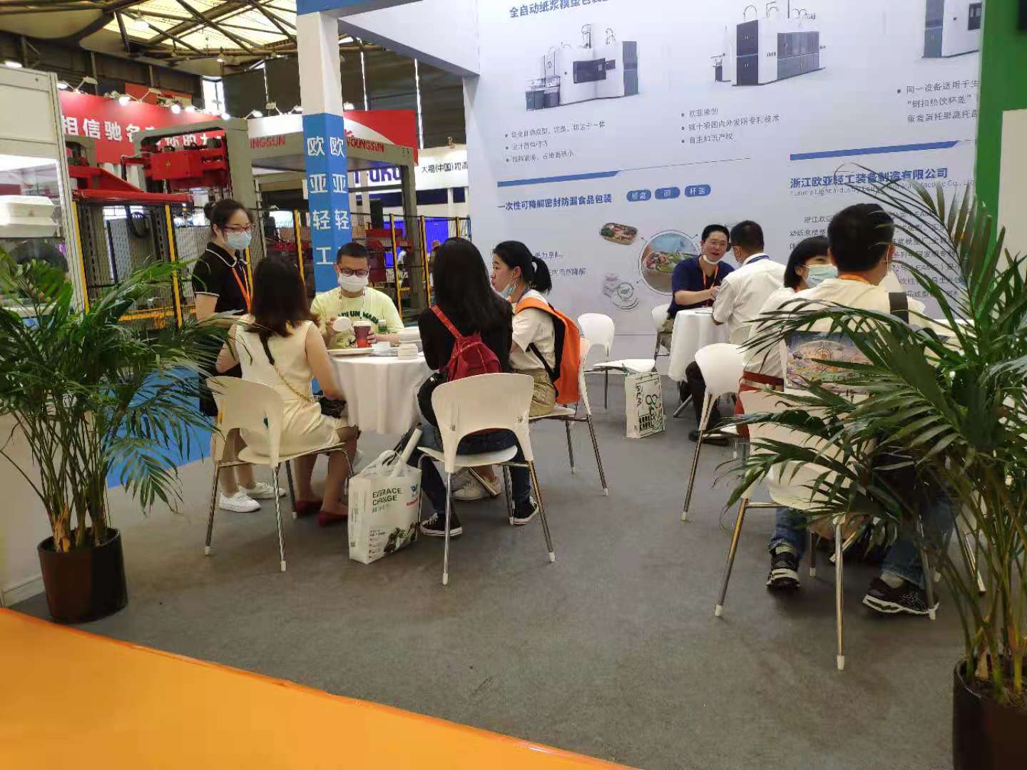 2021中國包裝容器展在上海新國際博覽中心舉行,iPackCon中國包裝容器展覽會是國內(nèi)專業(yè)的全品種包裝容器專業(yè)展示平臺,集中展示紙、塑料、金屬、玻璃等材質(zhì)包裝容器,創(chuàng)新包裝設(shè)計,包裝發(fā)展趨勢以及整體包裝解決方案。隨著國際國內(nèi)禁塑料工作的推進(jìn),可完全自然降解的植物纖維模塑制品在包裝領(lǐng)域的地位凸顯。參加本次會展的有國內(nèi)植物纖維(紙漿)模塑制品制造商、設(shè)備制造商、助劑供應(yīng)商。歐亞輕工(EAMC)參加了本次會展,展會上展出了EAMC“成型、定型、切邊、打孔”一體機(jī)和EAMC紙漿模塑杯蓋生產(chǎn)技術(shù)。