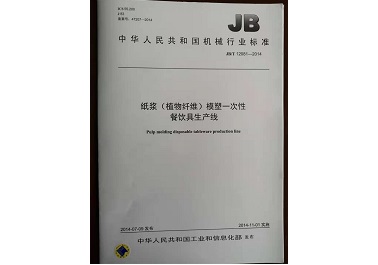 中華人民共和國(guó)行業(yè)標(biāo)準(zhǔn):?紙漿(植物纖維)模塑一次性餐飲具生產(chǎn)線?2014-11-1實(shí)施。標(biāo)準(zhǔn)代號(hào)JB/T 12081-2014。本標(biāo)準(zhǔn)由鄭天波起草。是關(guān)于環(huán)保餐具設(shè)備生產(chǎn)線的紙漿模塑設(shè)備方面的第一個(gè)行業(yè)標(biāo)準(zhǔn)。